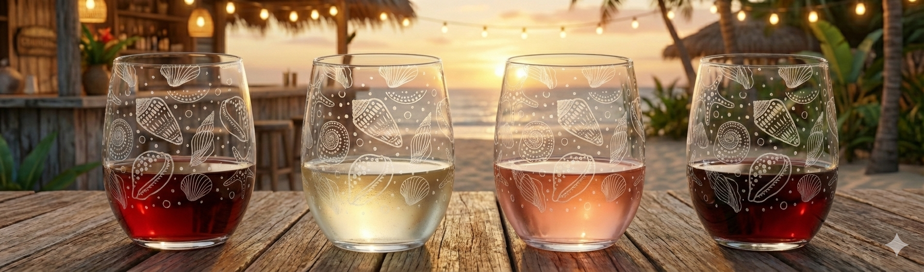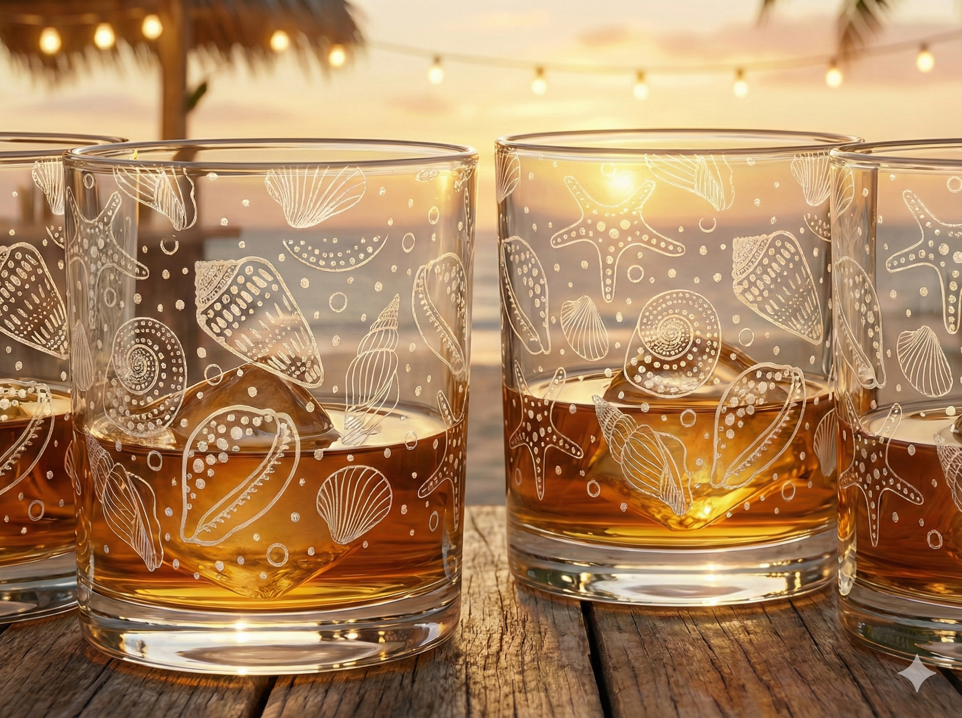 Beautifully engraved glassware for summer. A seamless pattern of shells and starfish is engraved 360 degrees around the glass. These glasses are great for wedding gifts, graduation, groomsman gifts, birthday gifts and housewarming gifts.